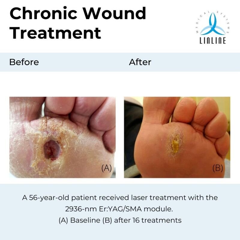 Le laser Erbium affecte non seulement les tissus mais aussi l'exsudat de la plaie, y compris les détritus tissulaires, la fibrine, le biofilm et la microflore, c'est-à-dire que le débridement des surfaces de la plaie est réalisé sous l'effet de l'ablation laser. Étant donné que le laser erbium ne cause pas de dommages thermiques aux tissus sous-jacents, le débridement au laser est effectué de manière non traumatisante.